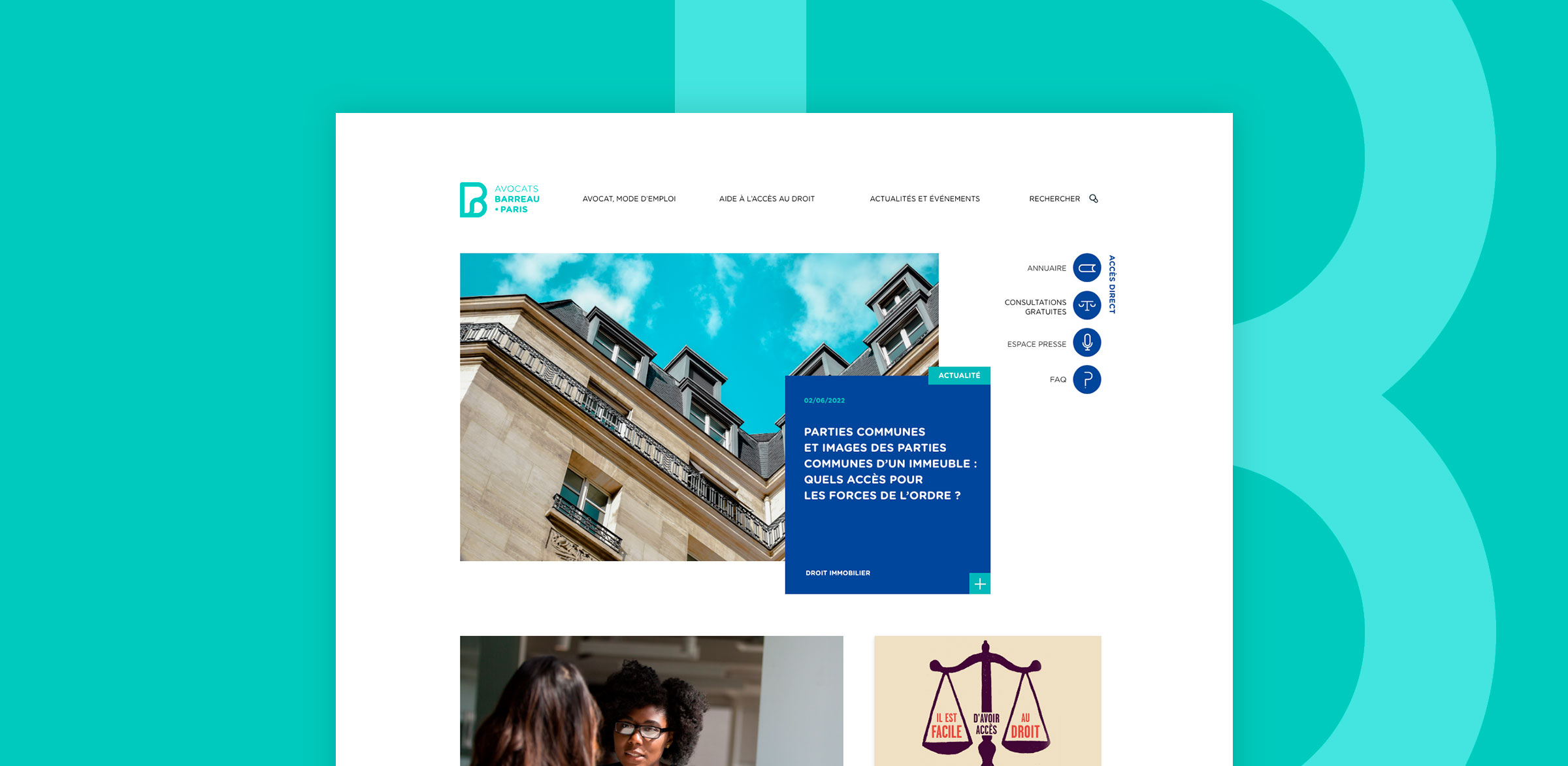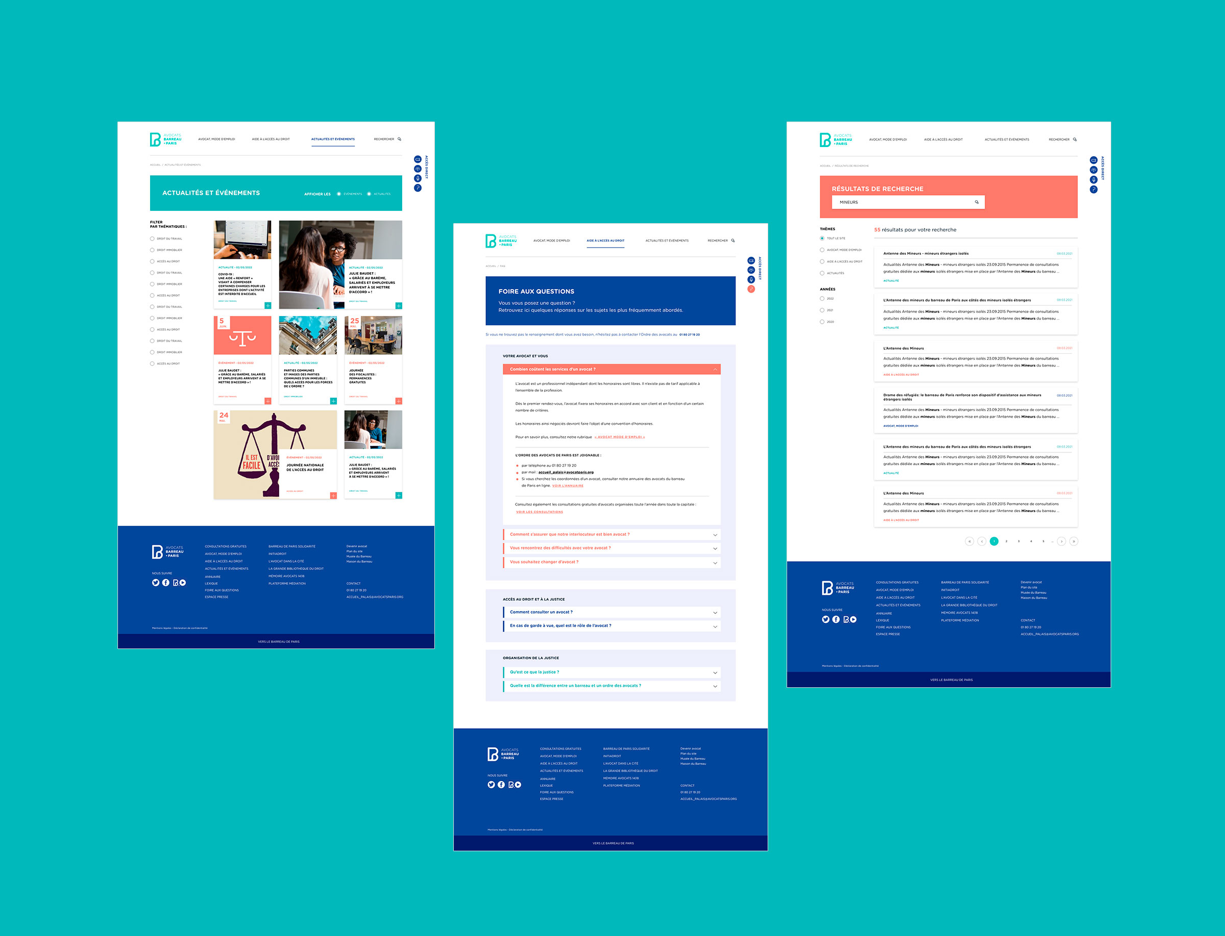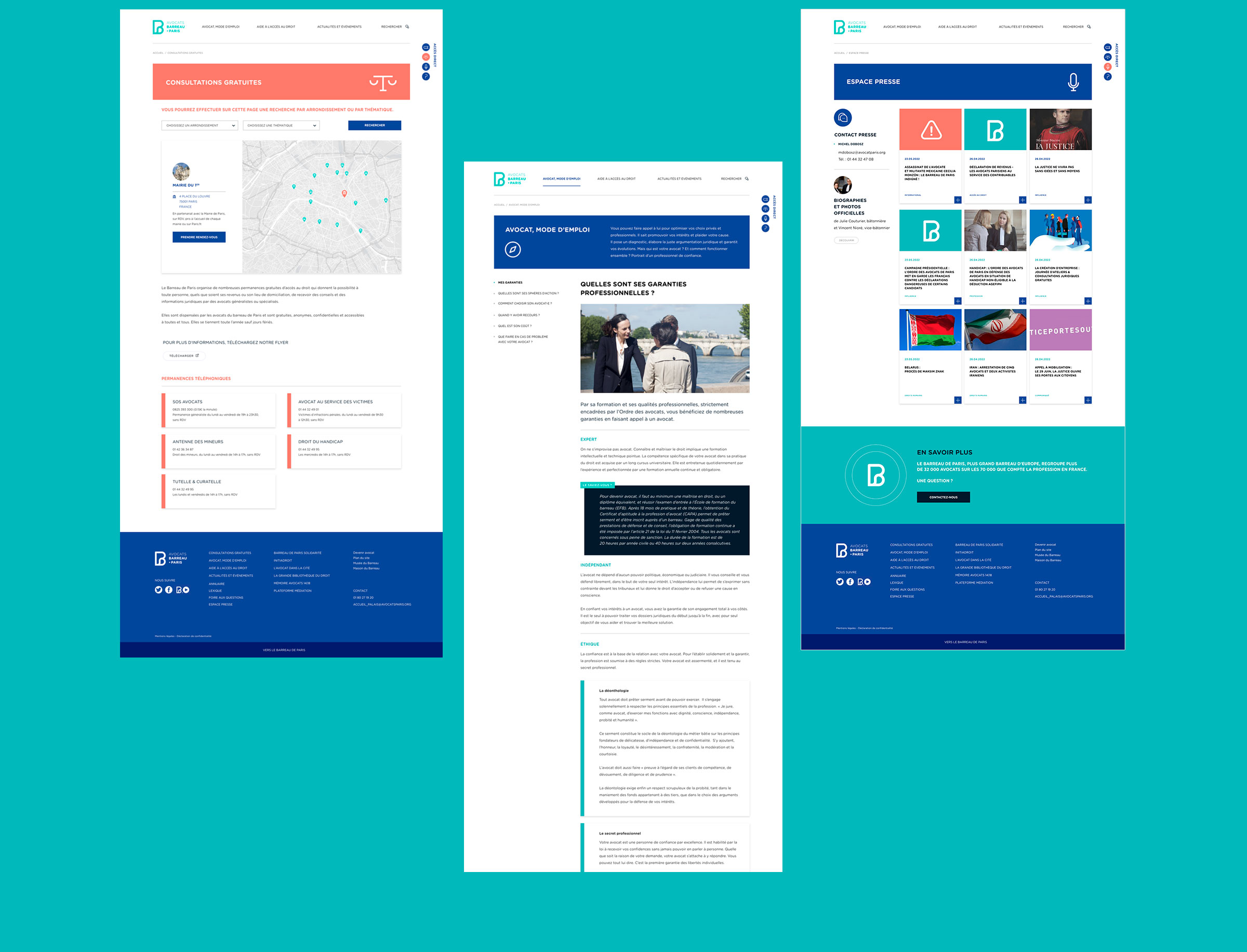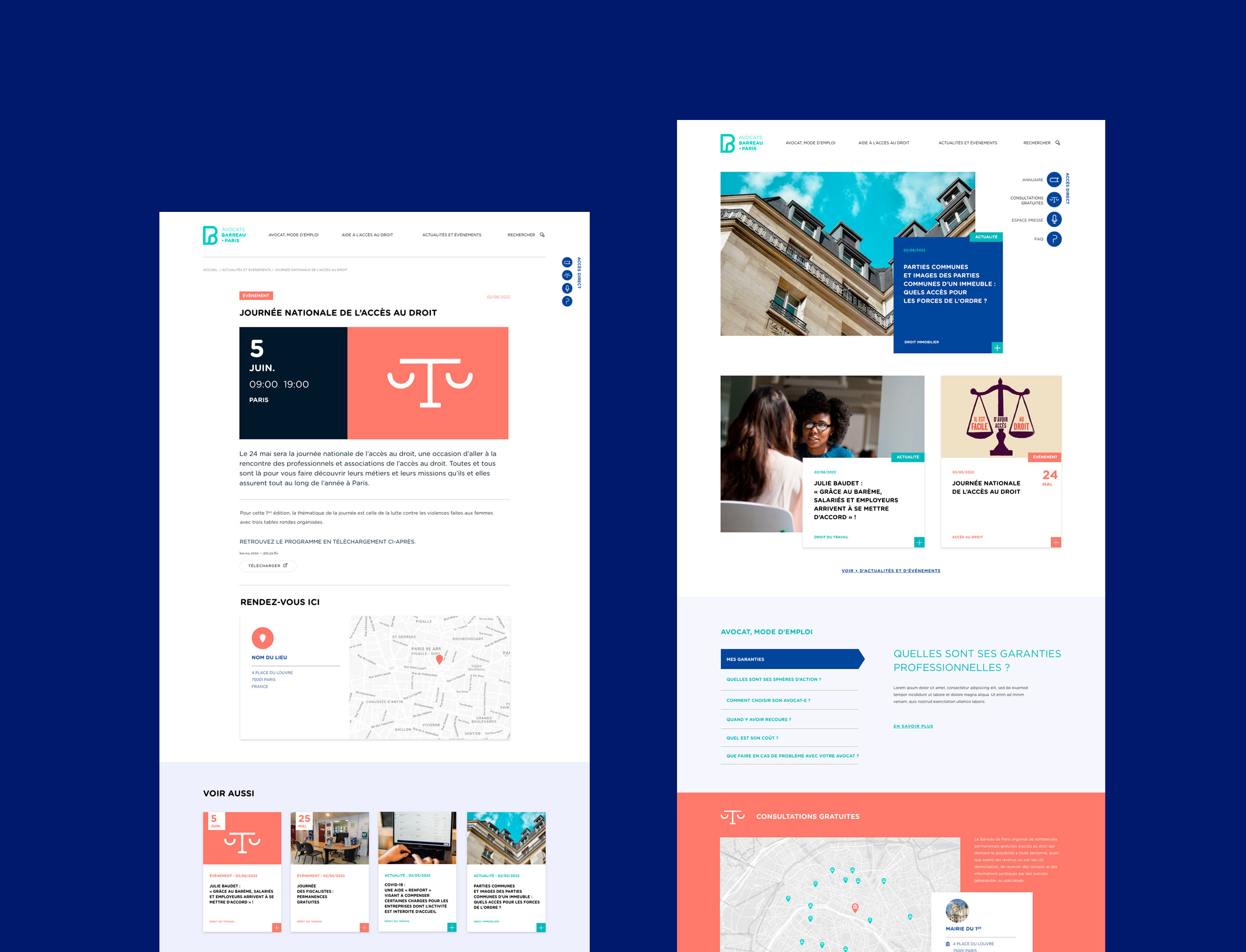 Rebranding du site public du Barreau de Paris pour être en cohérence avec le site dédié aux avocats. Organisation de l’information repensée et navigation simplifiée.