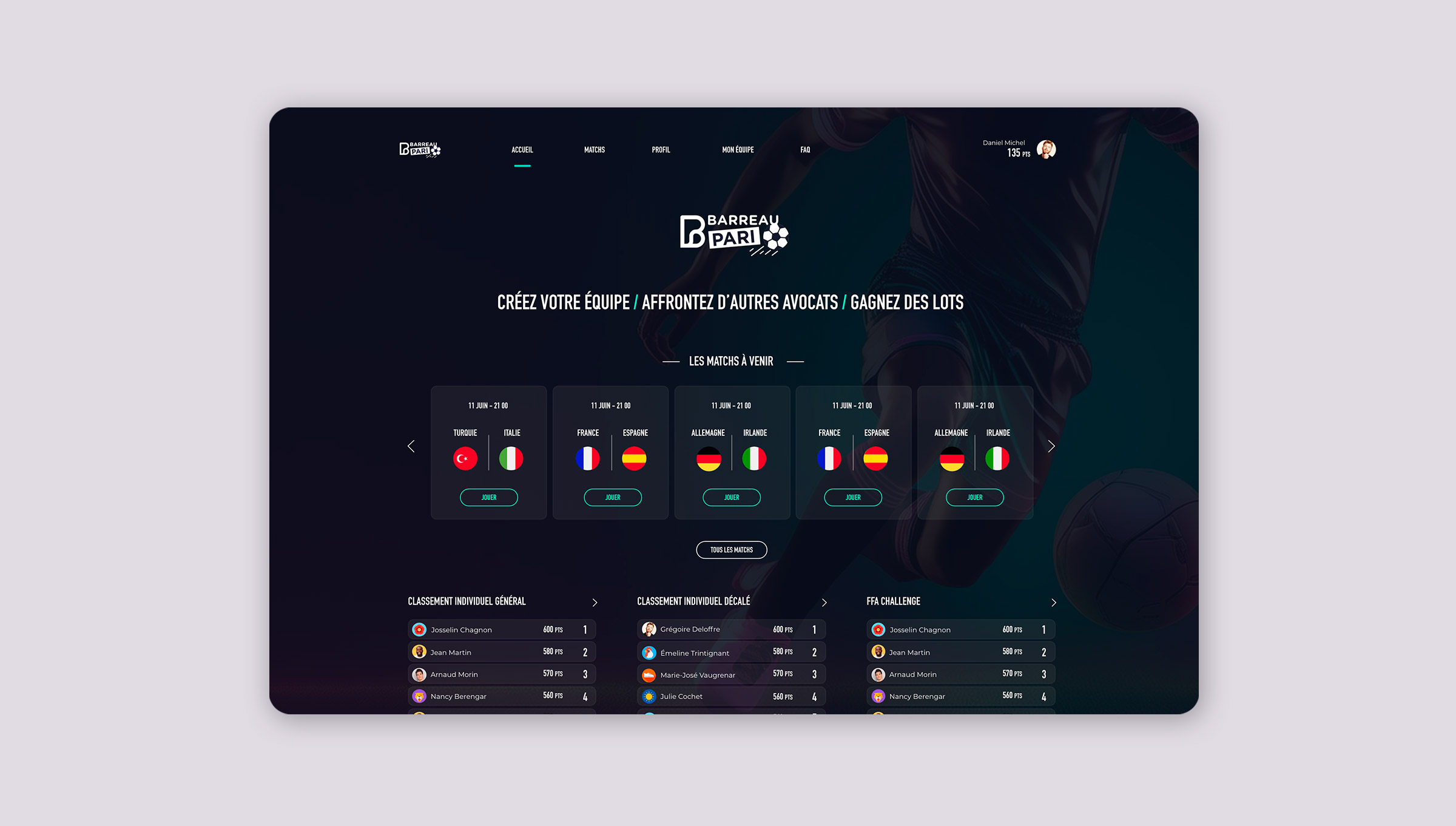 Une occasion de faire une pause dans la période noire de la pandémie. Cette plateforme a mobilisé plus de 5000 participants pour plus de 20000 pronostics en ligne. UX/UI de la plateforme pensé en mobile first.