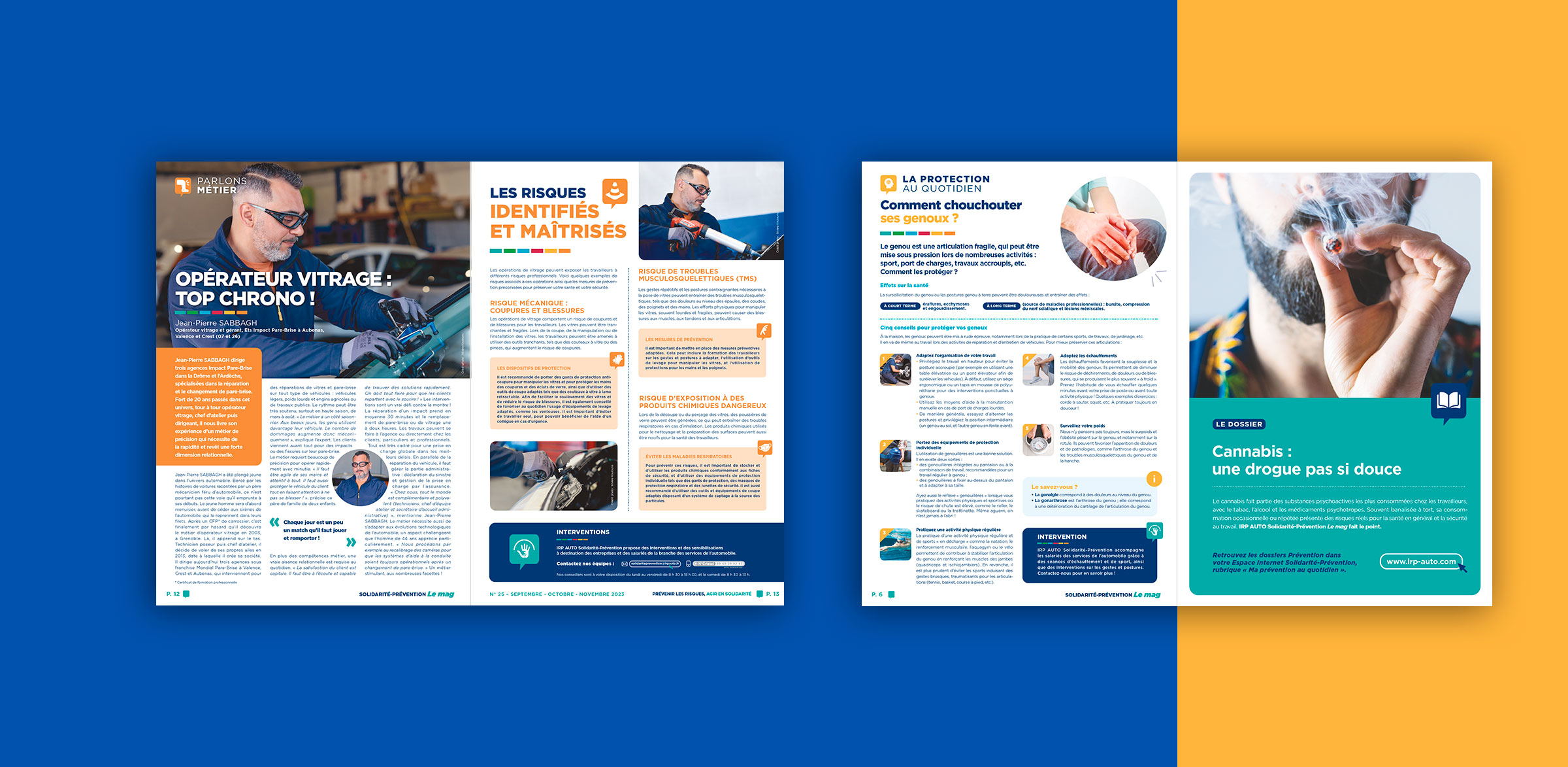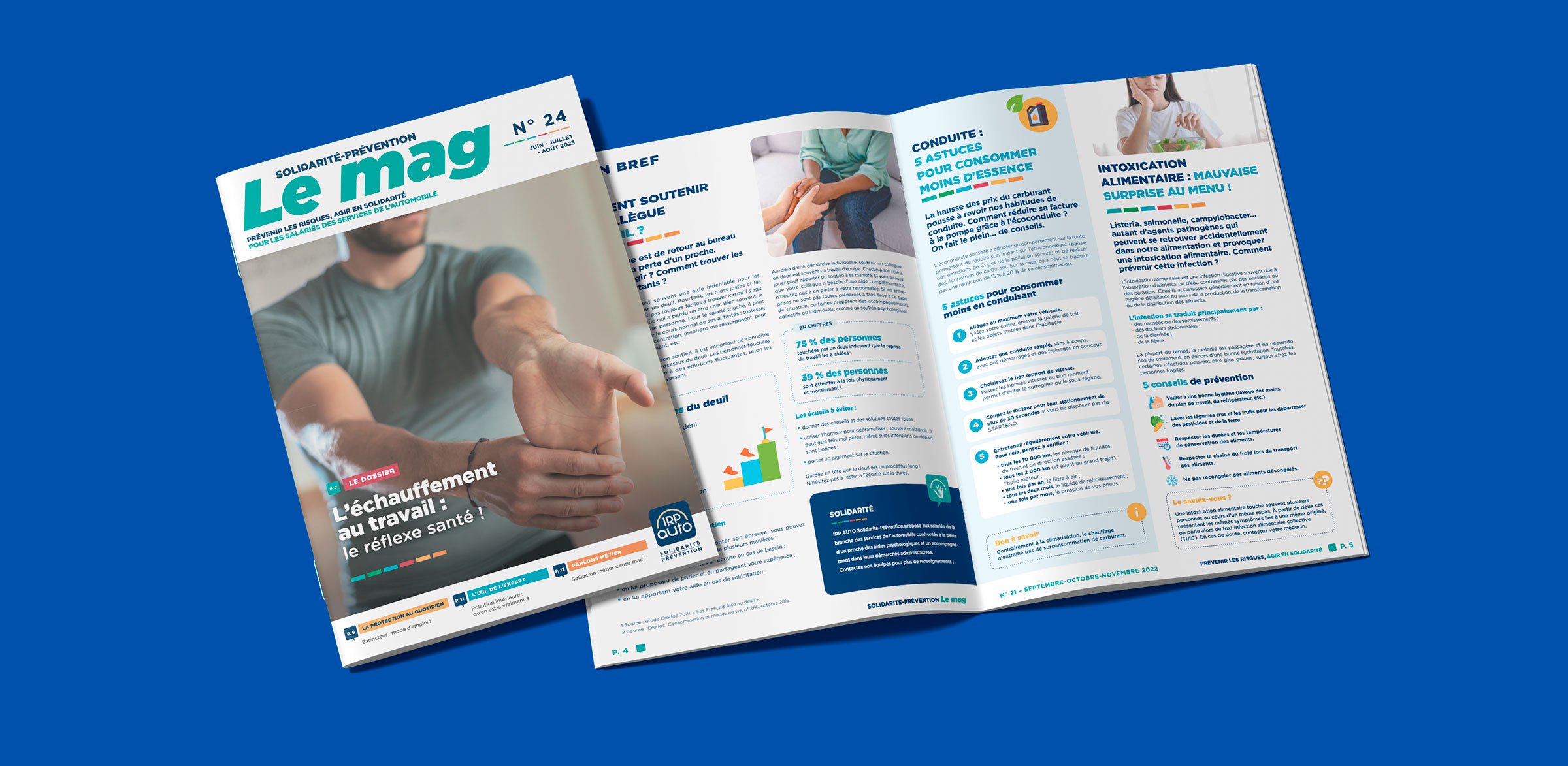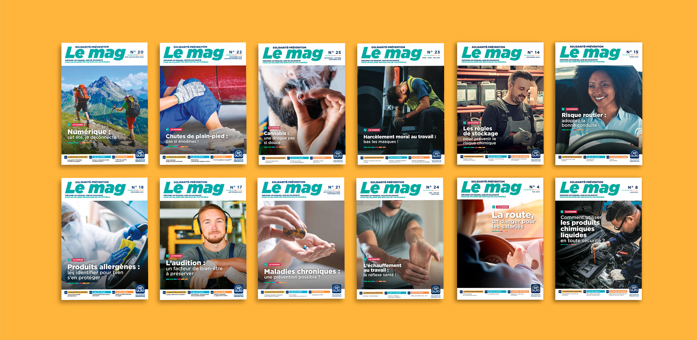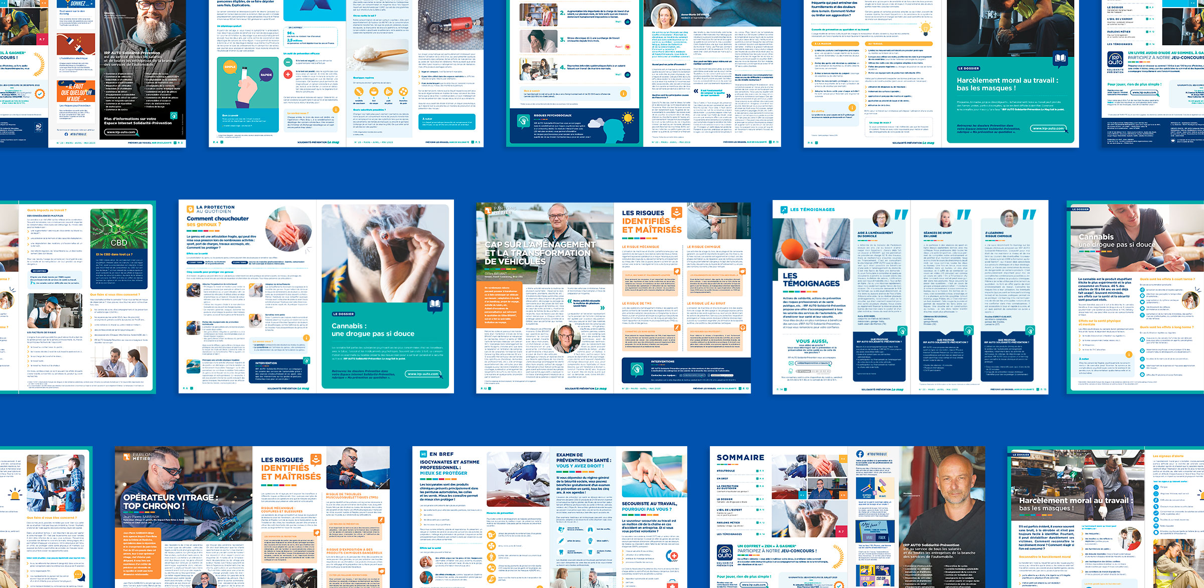 Design de la maquette du magazine Le mag, pour IRP AUTO, à destination des professionnels de l’automobile. Ce trimestriel vise à sensibiliser les salariés aux problématiques de santé et de solidarité.
