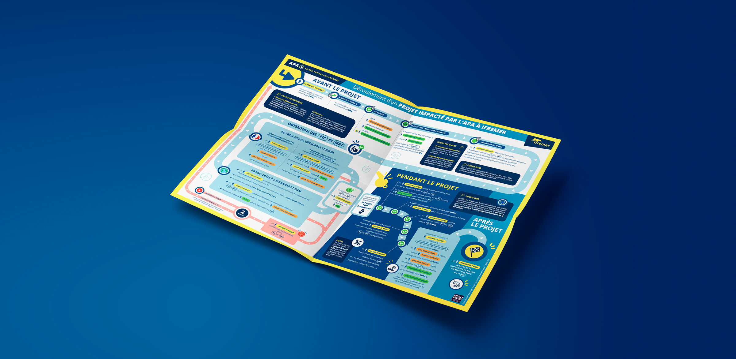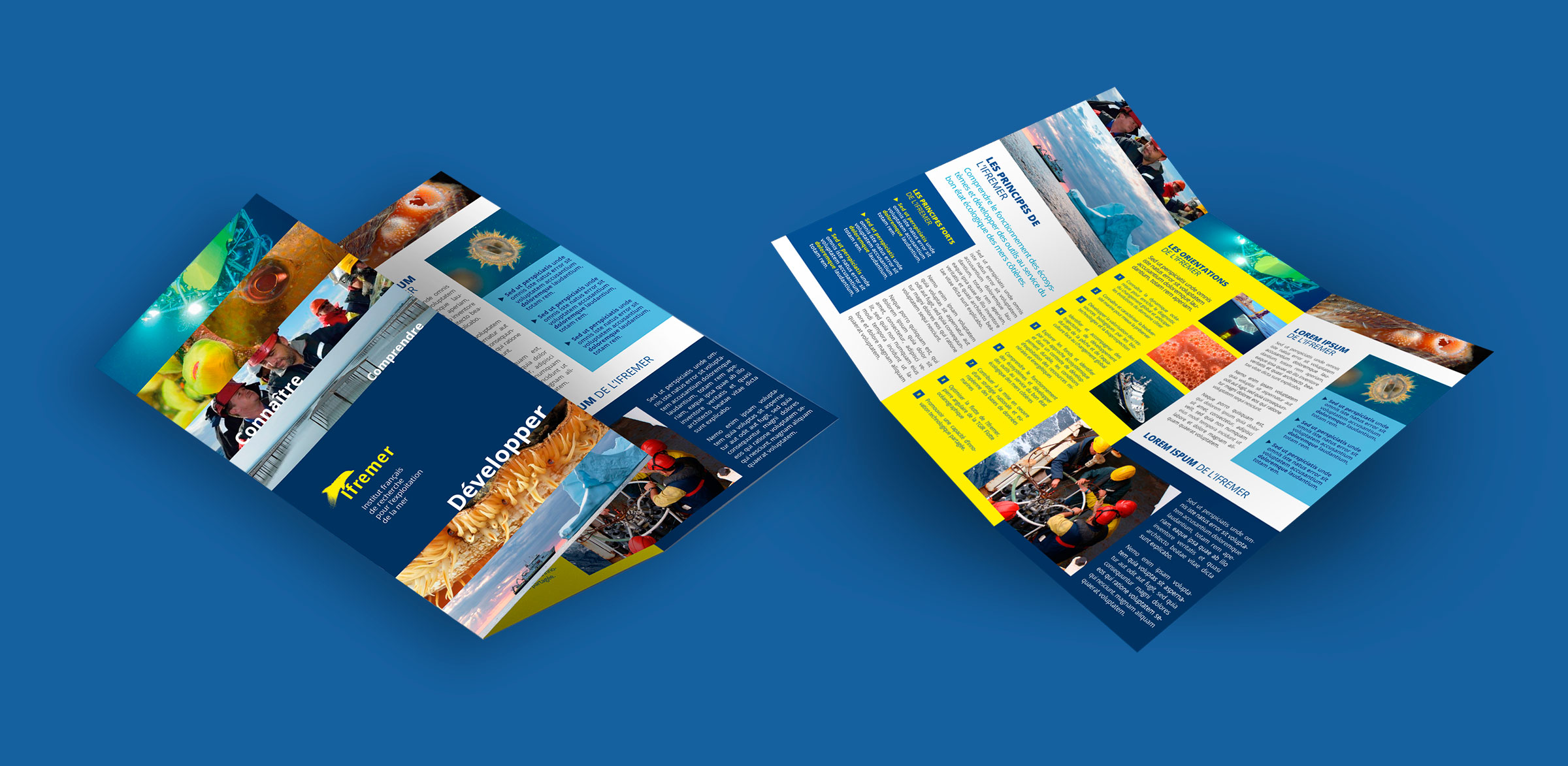 Réalisation de différents supports print pour l’Ifremer, l’institut français de recherche dédié à la connaissance de l’océan. La série de posters présente le processus de réalisation des projets de recherche.