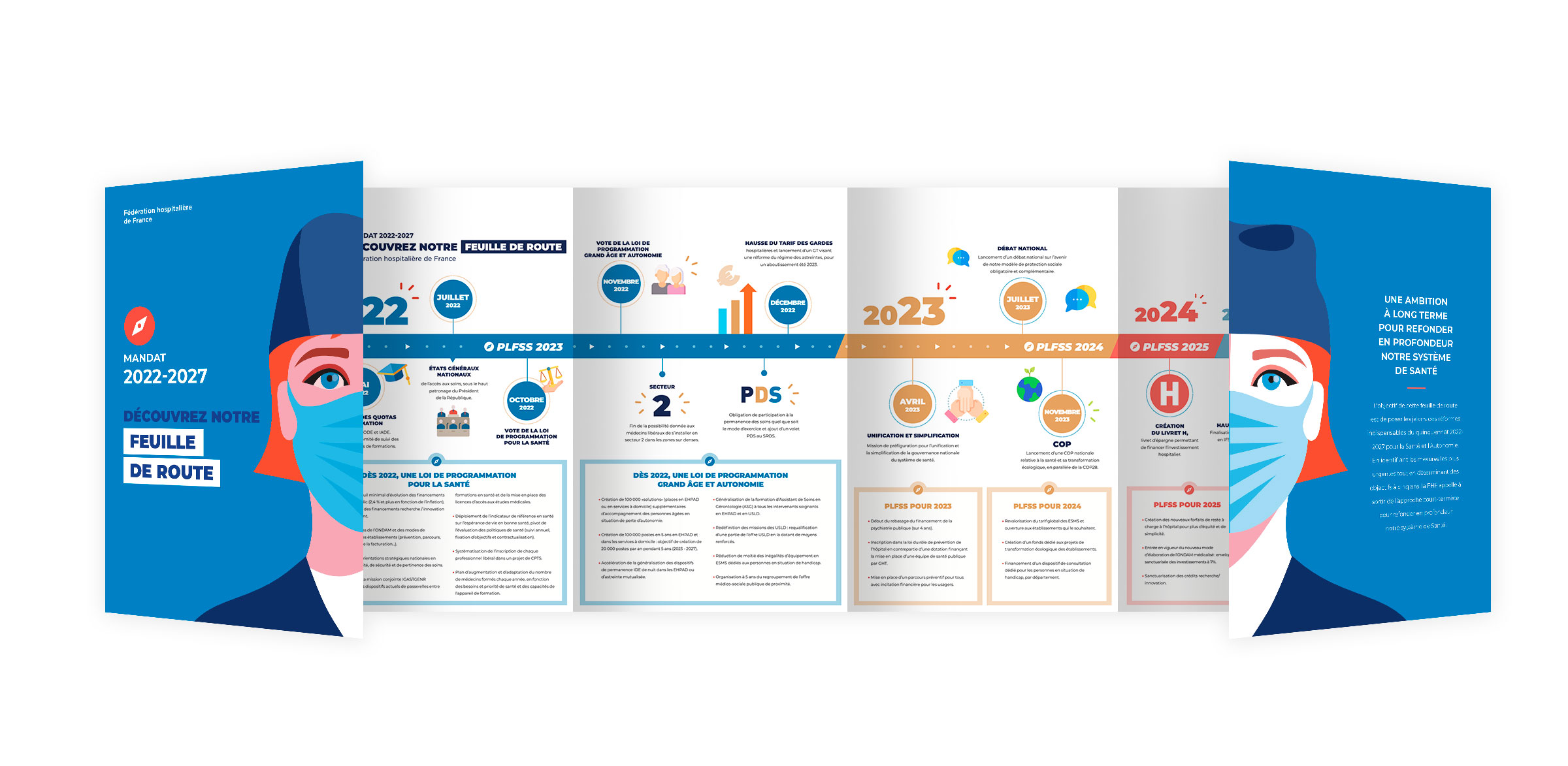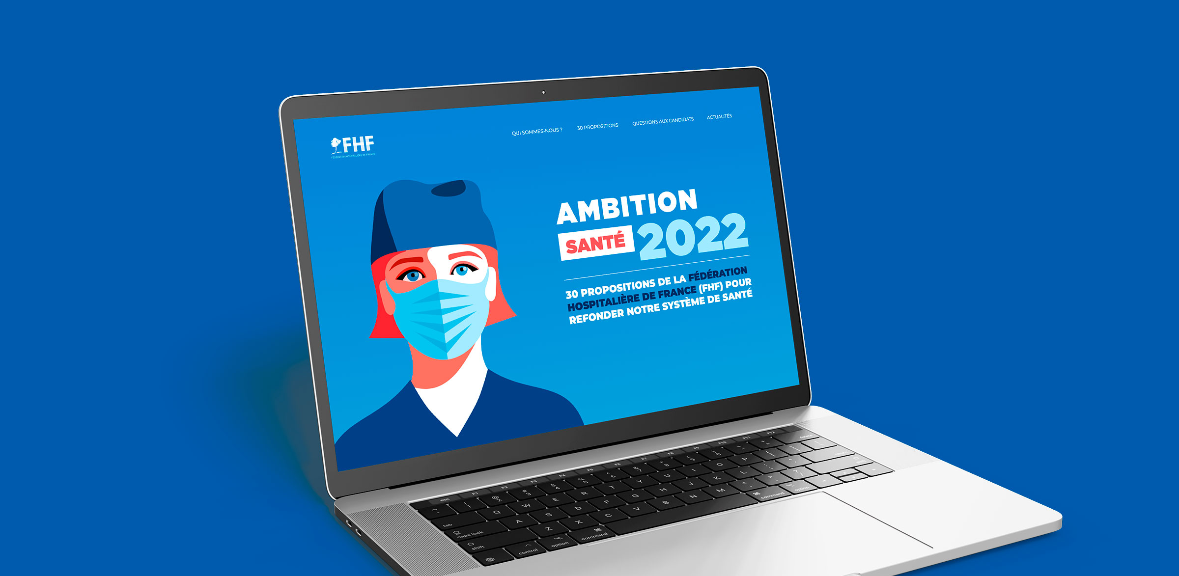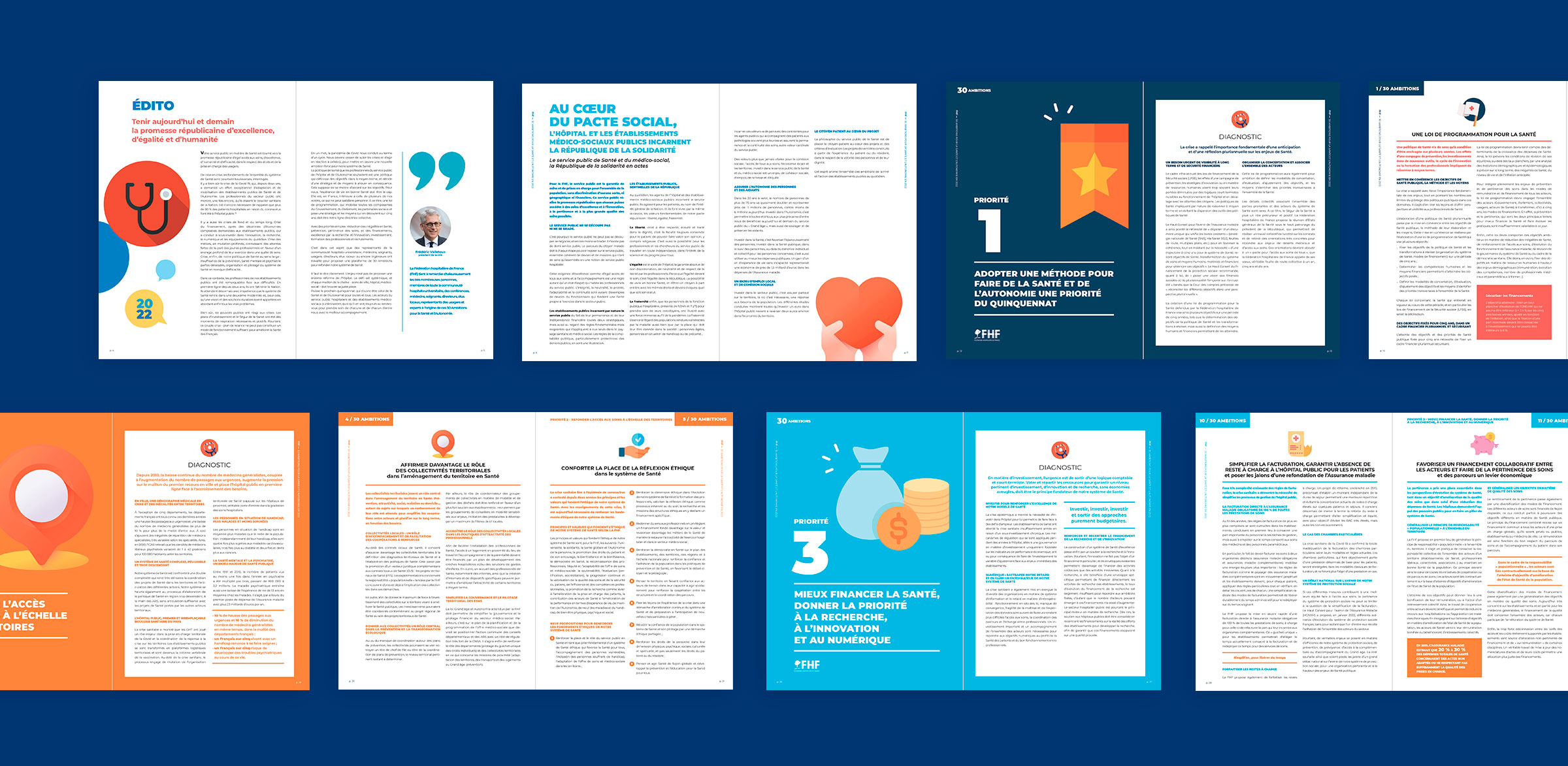 Design de la brochure et de la plateforme web Ambition Santé 2022. Pour les éléctions présidentielles de 2022, la FHF a proposé 30 propositions pour la santé et a interrogé les différents candidats sur cette thématique.