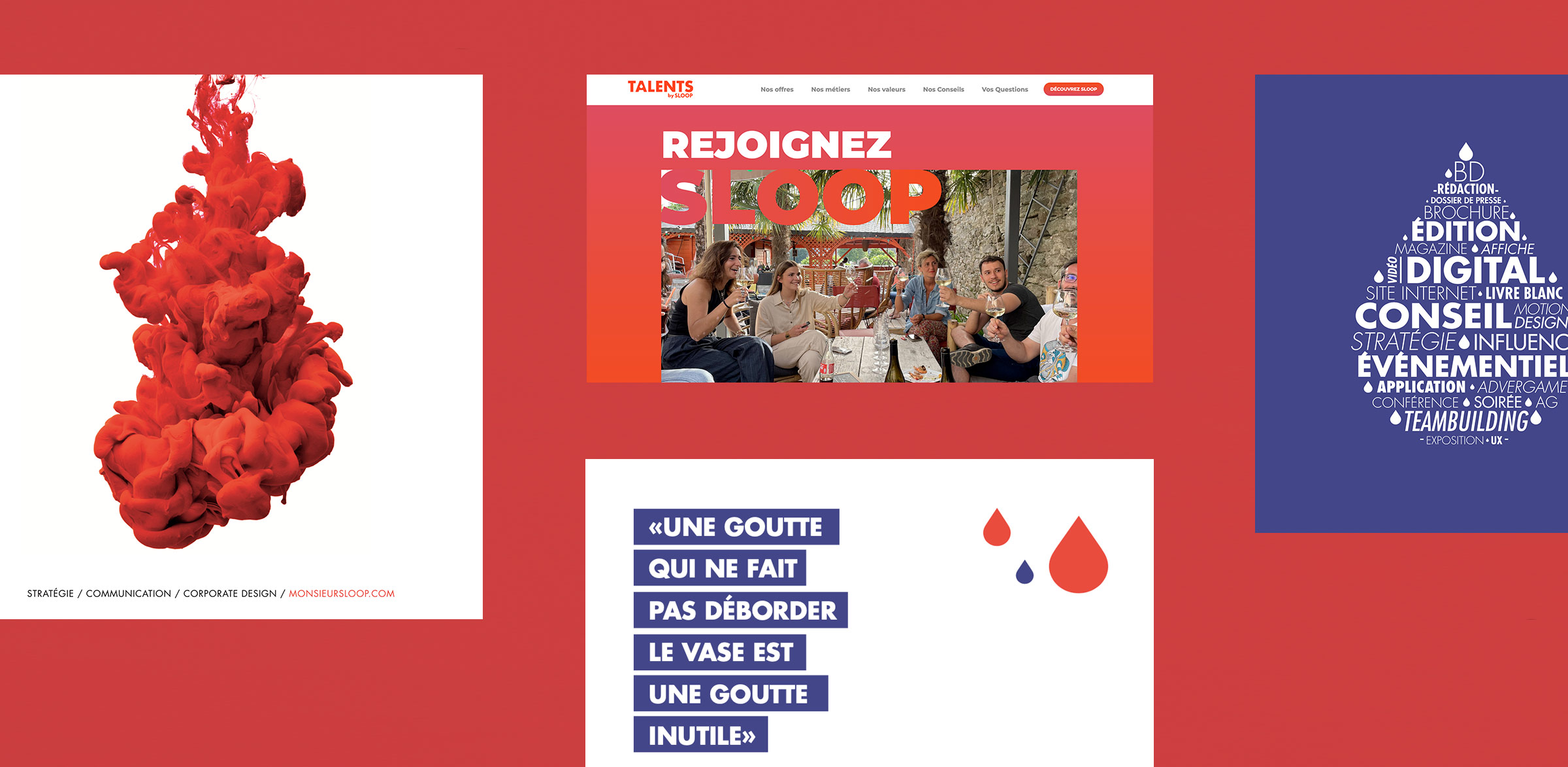 Réalisation de l’identité globale de l’agence de communication SLOOP (précédemment Monsieur SLOOP). Faire de la goutte un signe fédérateur, une source de créativité et un clin d'oeil à l'histoire de l'agence qui a fait ses premiers pas sur un bateau. Une identité toujours en mouvement mais qui garde une cohérence au fil du temps.