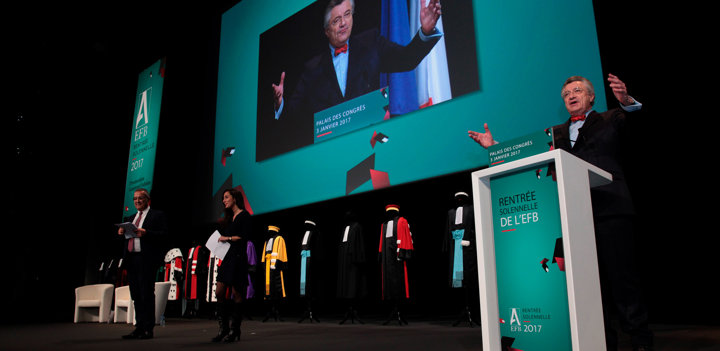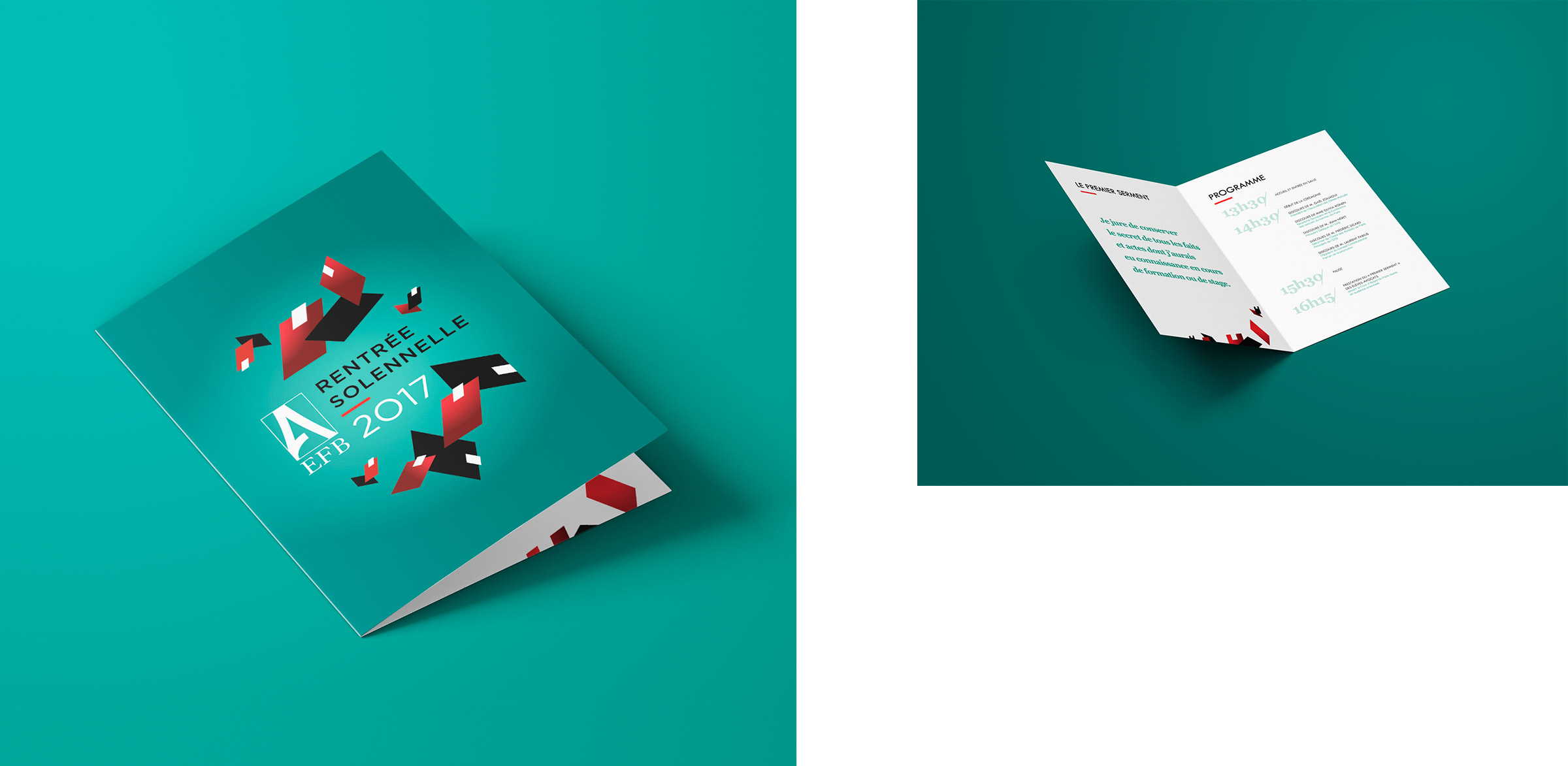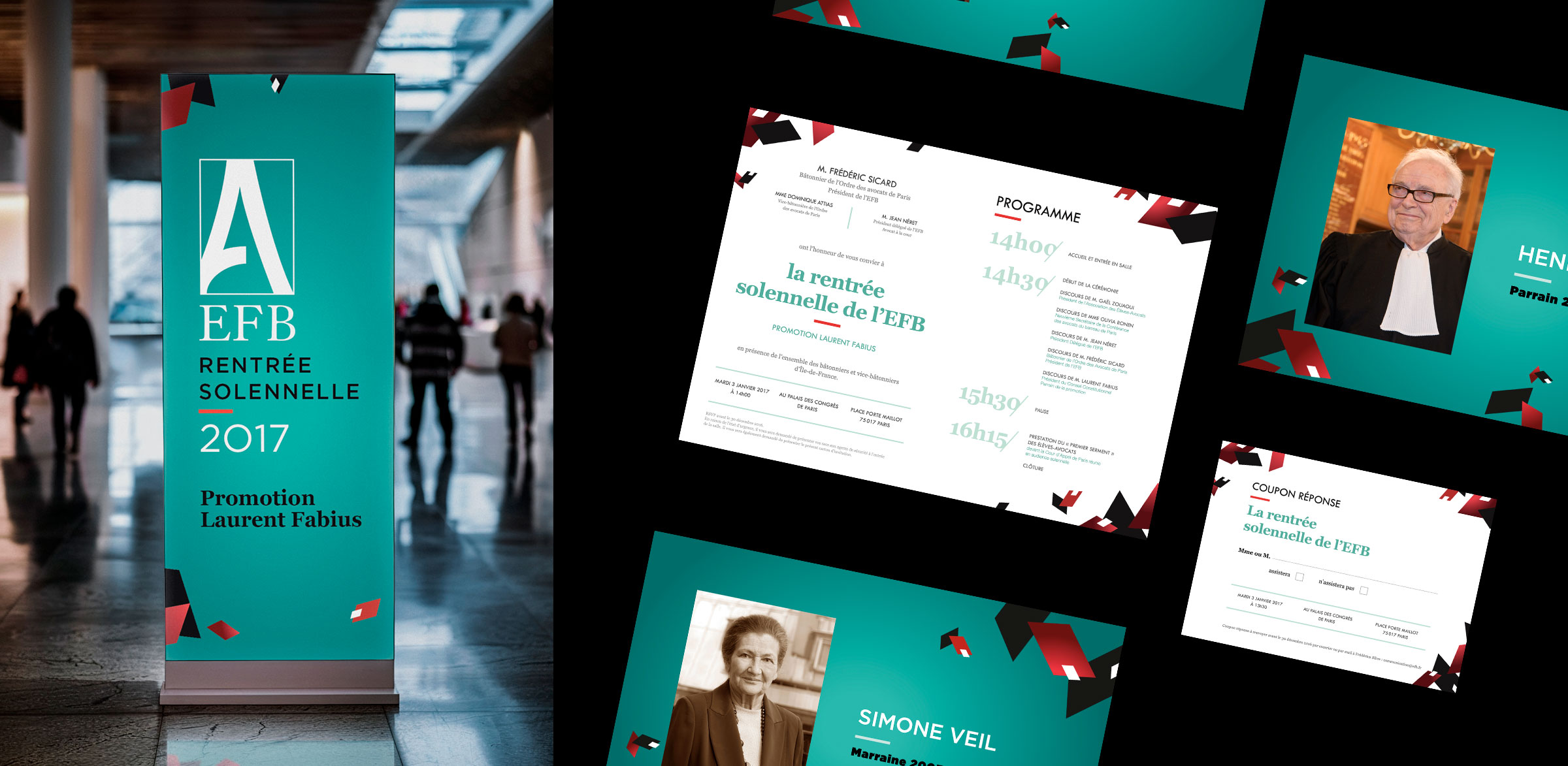 Design de supports de communication pour la cérémonie de prestation de serment de l’école des avocats EFB, sur le thème du rapprochement entre avocats et magistrats.