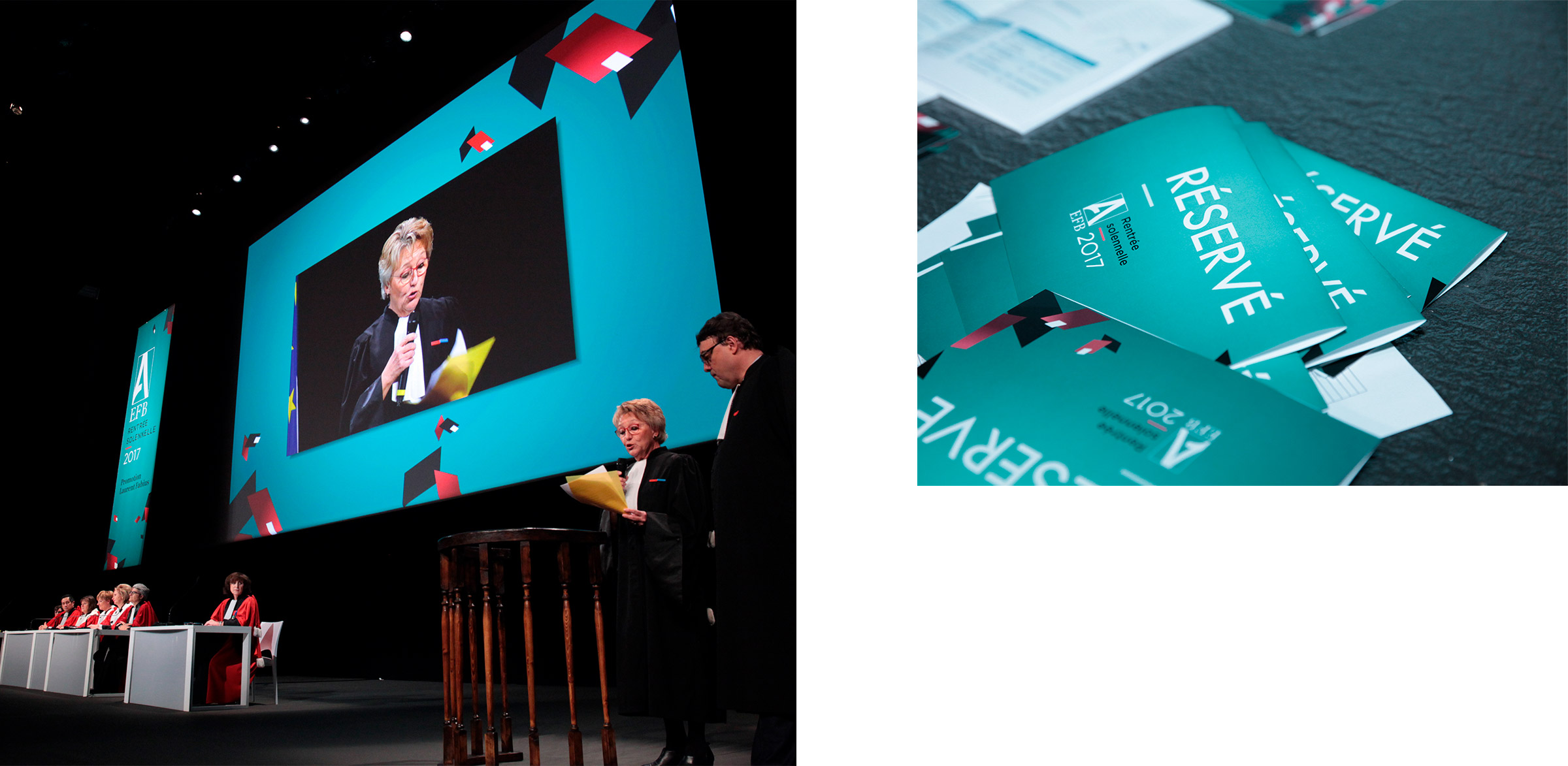 Design de supports de communication pour la cérémonie de prestation de serment de l’école des avocats EFB, sur le thème du rapprochement entre avocats et magistrats.
