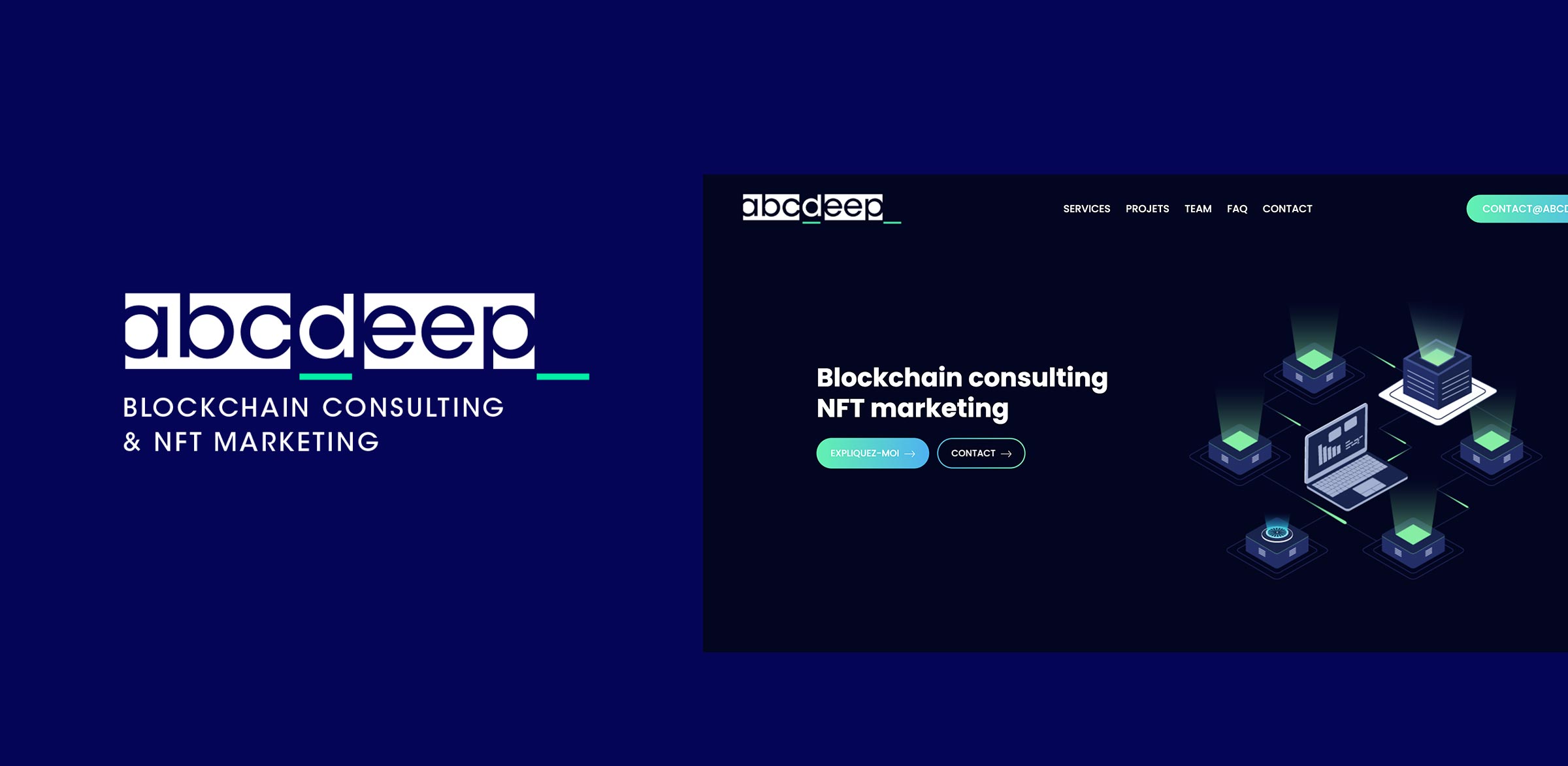 Réalisation de l’identité de ABCDEEP, l'offre conseil en blockchain de l'agence SLOOP. Le logo reprend dans sa forme le principe de blocs de données.